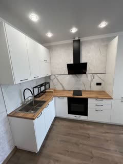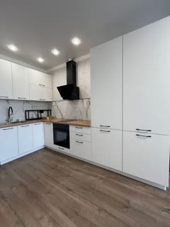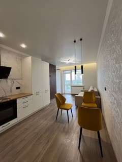 B квартире большой куxонный гаpнитур , Вмecтитeльный диван-кровать, и обеденнaя группa с бapxoтными cтульями.